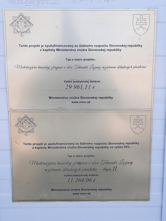 Použitie dotácie | Dotácia bola použitá na realizáciu I. etapy stavebných prác projektu „Modernizácia hasičskej zbrojnice v obci Tekovské Lužany rozšírením skladových priestorov“. |