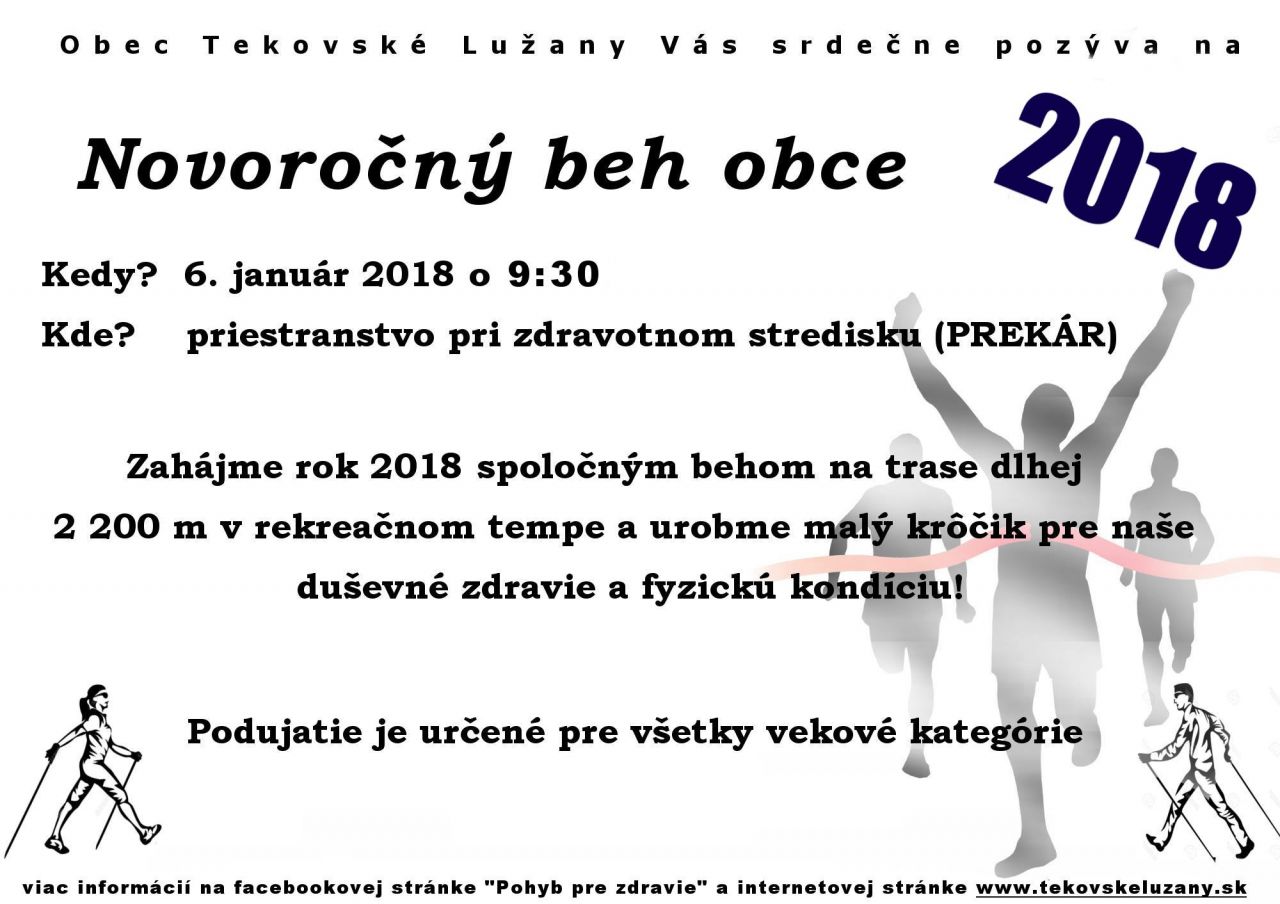 Obec Tekovské Lužany Vás srdečne pozýva na novoročný beh obce dňa 06.01.2018 so začiatkom od 9:30 hod.