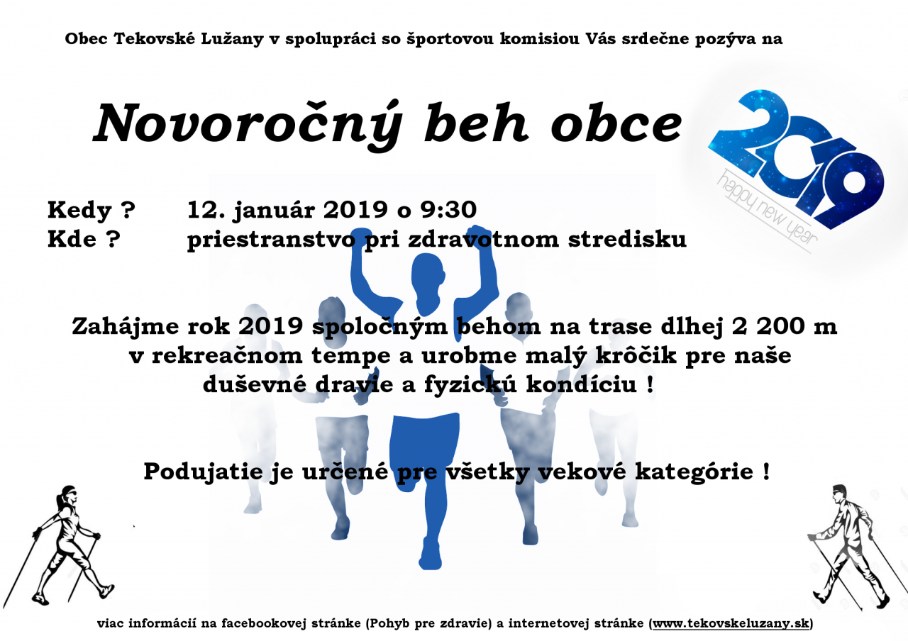 Srdečne Vás pozývame na novoročný beh obce, ktorý sa uskutoční dňa 12.1.2019 so začiatkom o 9:30 hod. Miesto štartu: parkovisko pri zdravotníckom centre